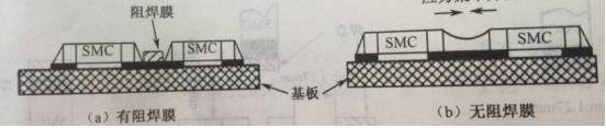 2、二是當有兩個以上靠得很近的SMC的焊盤共用一段導線時,應用阻焊膜將其分開,避免釬料收縮時產生應力使SMC移位或拉裂。