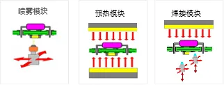 預(yù)熱模塊由底部預(yù)熱、頂部預(yù)熱、焊接保溫模塊組成。各溫區(qū)獨立循環(huán)、獨立控溫。可根據(jù)產(chǎn)品尺寸,自動關(guān)閉產(chǎn)品尺寸范圍外的加熱,節(jié)能簡單。