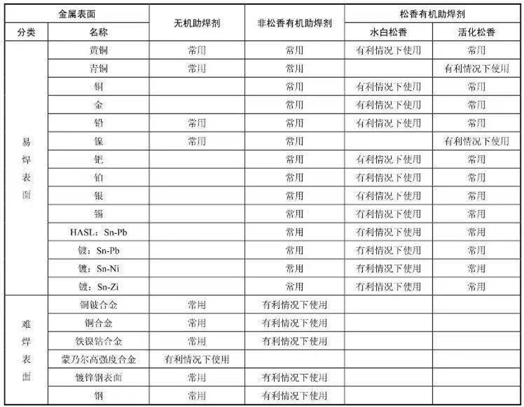 ②有利條件下使用:在表面無嚴重的銹膜或類似的污染時,可用水白松香助焊劑。通常這類金屬表面可用活化松香或非松香有機材料助焊劑進行焊接。