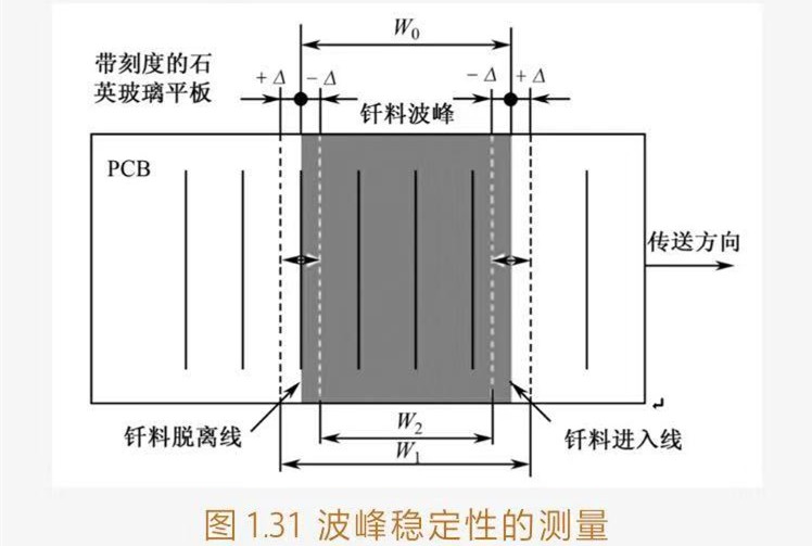 ③測試方法:將波峰高度調(diào)節(jié)至正常工作的高度H0上,然后將帶刻度的石英玻璃平板裝夾在傳送鏈上,將其運行至釬料波峰上調(diào)節(jié)好浸入深度,如圖131所示。觀測由于波峰高度的波動而導(dǎo)致玻璃平板上釬料波峰的進入線和脫離線之間闊度的變化[W2(Wo-2△)-Wo-W1(W0+2△)]。